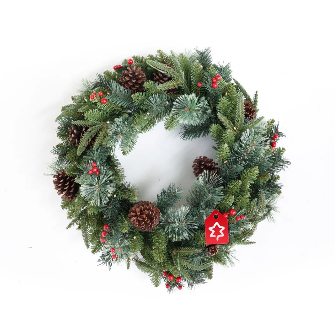 Weihnachtskranz Dekoriert 50 LED 60 cm in klassischer Ausführung ist eine schöne Dekoration für Tür, Tisch oder Fenster. Dichte Nadeln und hochwertige Verarbeitung halten viele Saisons. Die LED‑Beleuchtung mit 50 Dioden sorgt für ein sanftes, angenehmes Licht – ganz ohne Lampen wechseln.